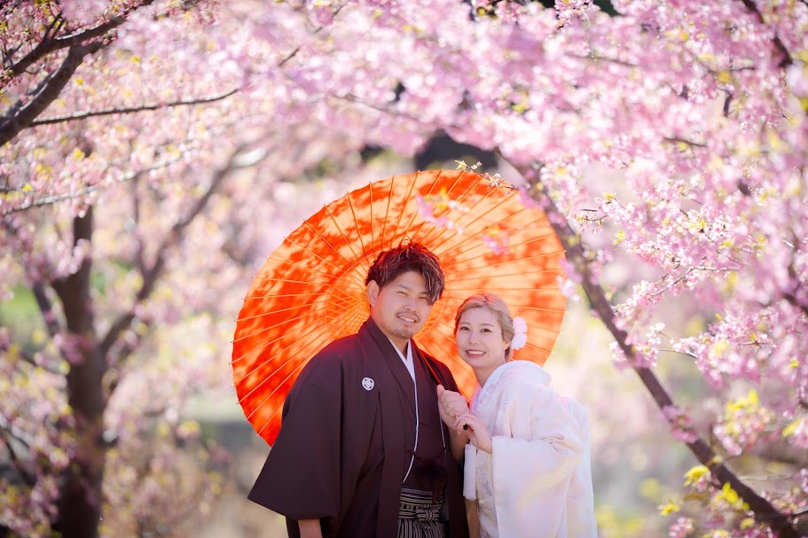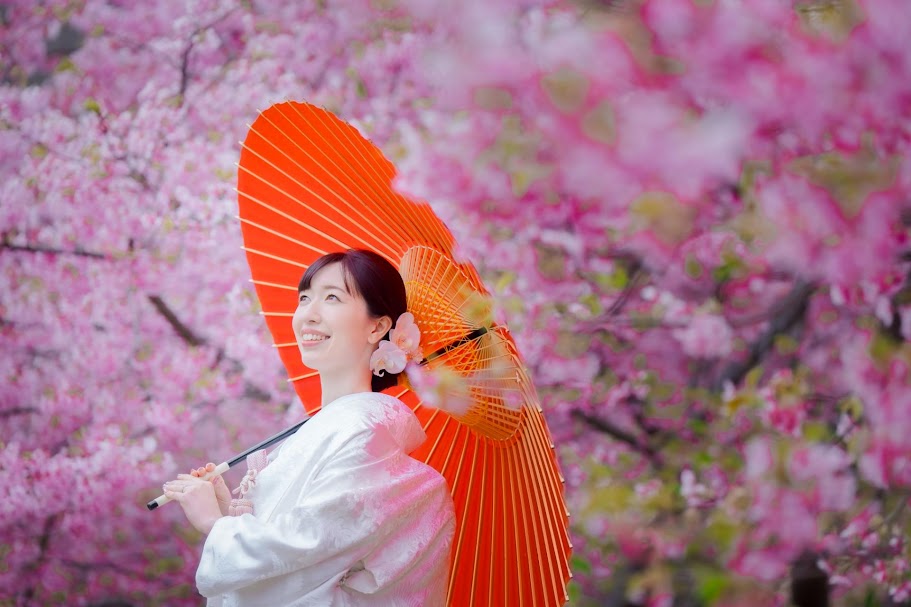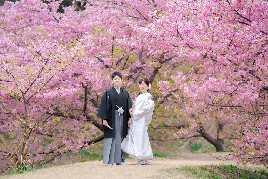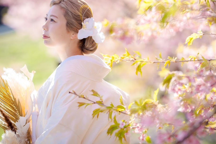 梅に続き、河津桜が咲き始める2月 色掛下や綿帽子などのコーディネイトで白無垢を楽しんで