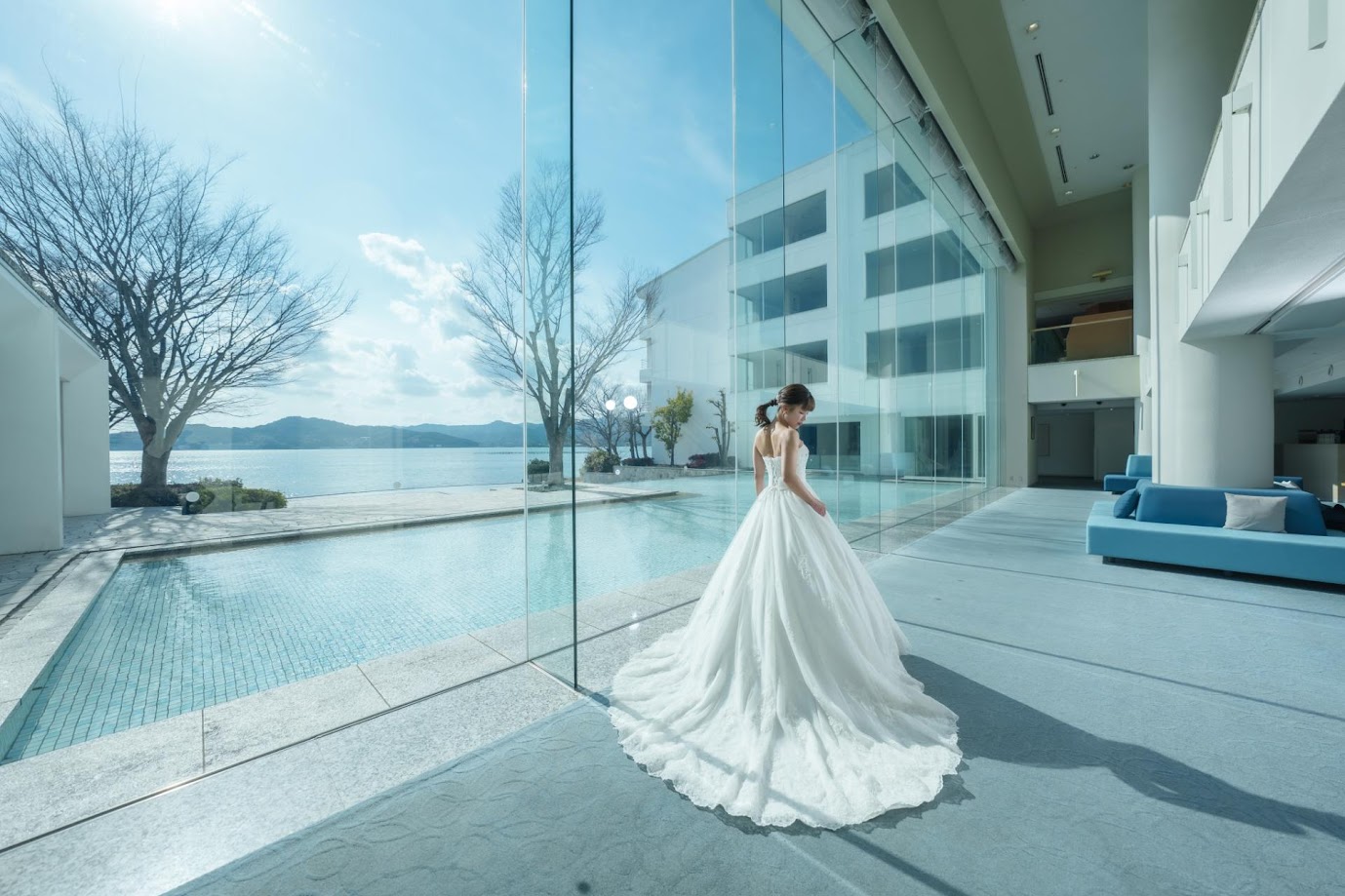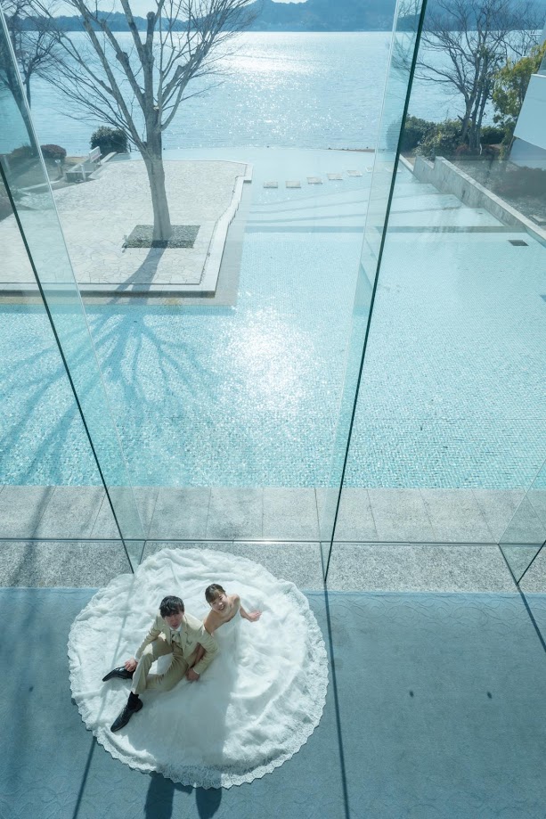 春のあたたかい光の中で撮影できる湖畔のテラスは浜名湖を一望できるフォトスポット。屋内での撮影も叶うので、ドレスやヘアスタイルを綺麗におさめたい花嫁さんに人気のロケ地です。