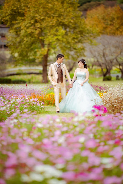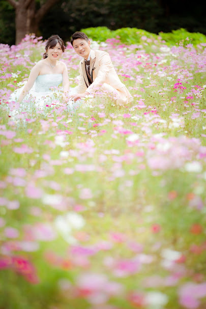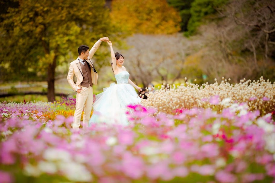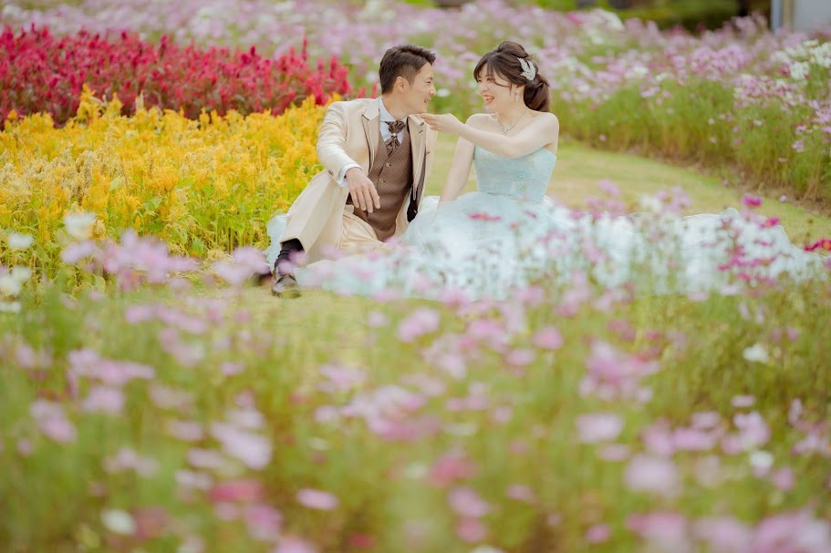 10月のフラワーパークはコスモスの最盛期。過ごしやすいシーズンでもあるので、ぽかぽかの秋の光のなかでゆったりと撮影を楽しんで。カラードレスの撮影もおすすめです。
