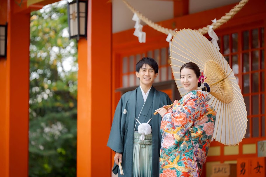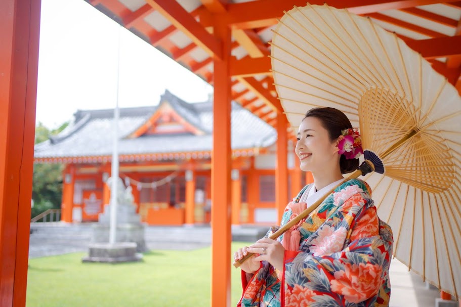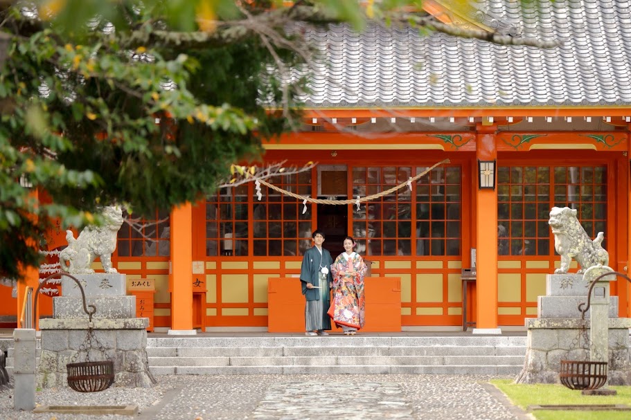 浜松駅から車で15分、アクセスのいい神社。朱色の境内や鳥居が和装姿によく映えます。