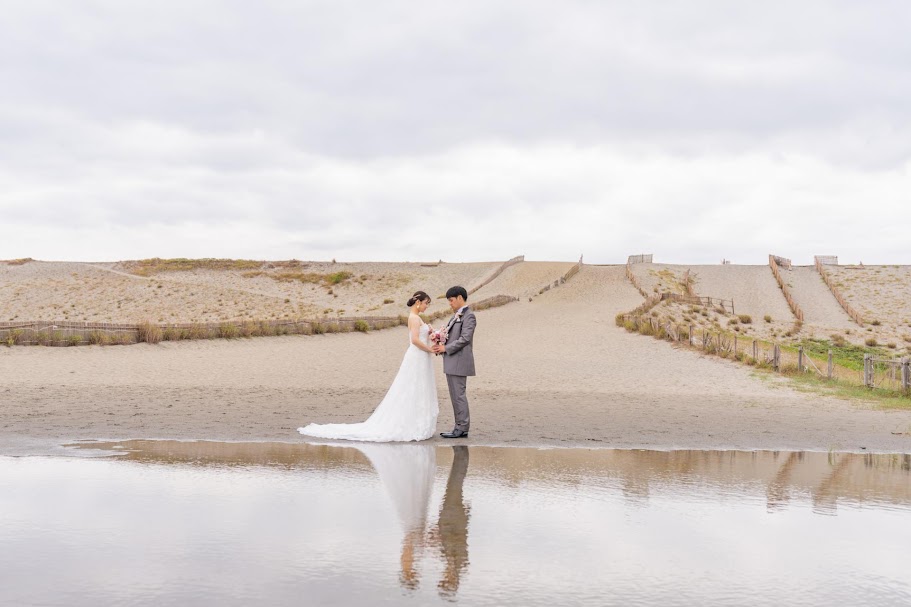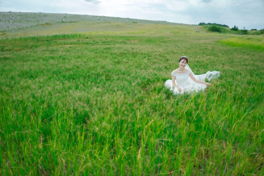 暑さも和らぐ10月。1年で一番過ごしやすい時期です。少しずつ秋の雲が表情を見せるので、砂丘と空、少し緑の残る草原を背景に撮影ができます。風を感じるロングベールでのカットもおすすめです。