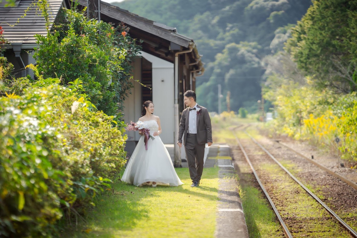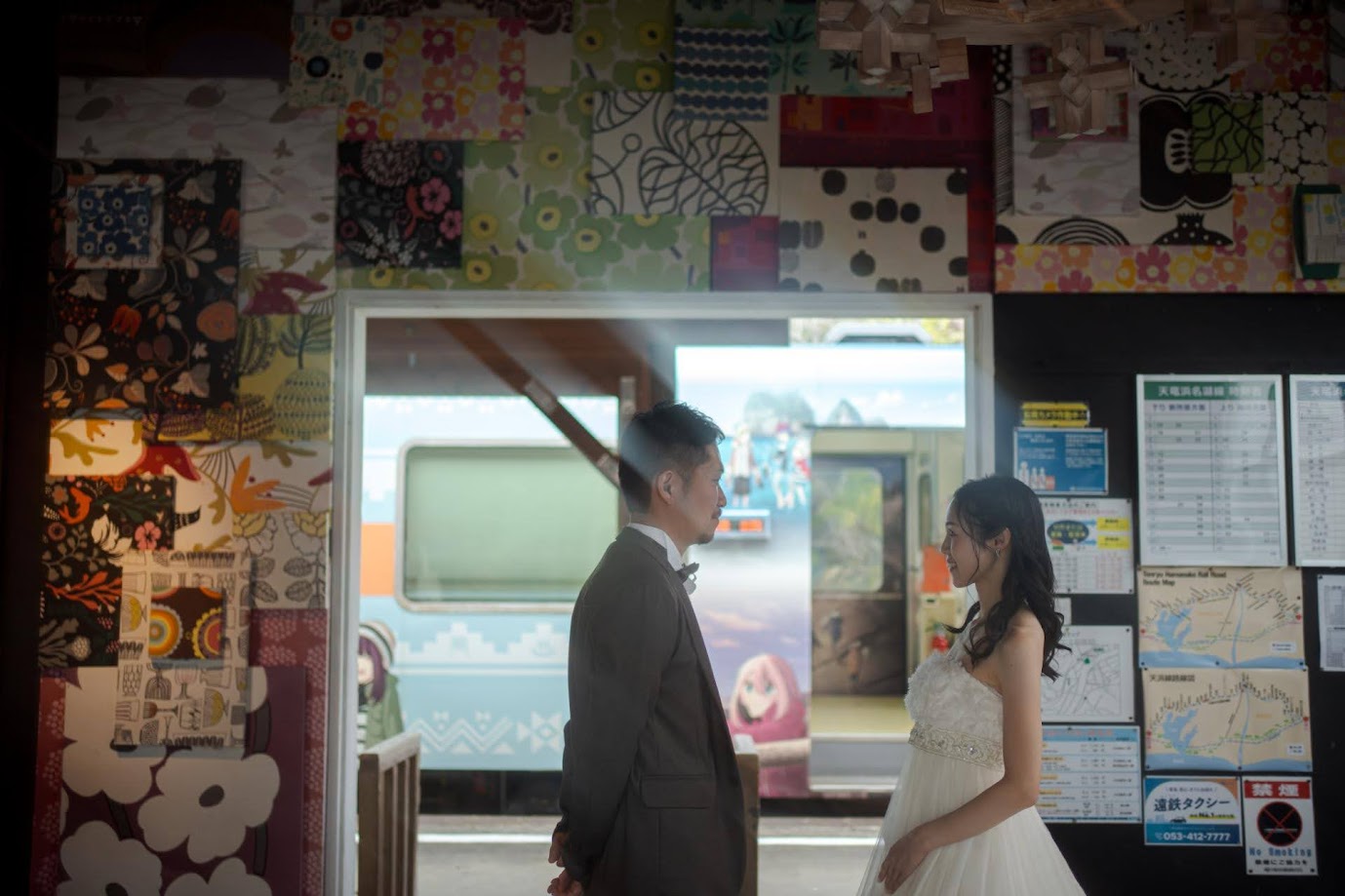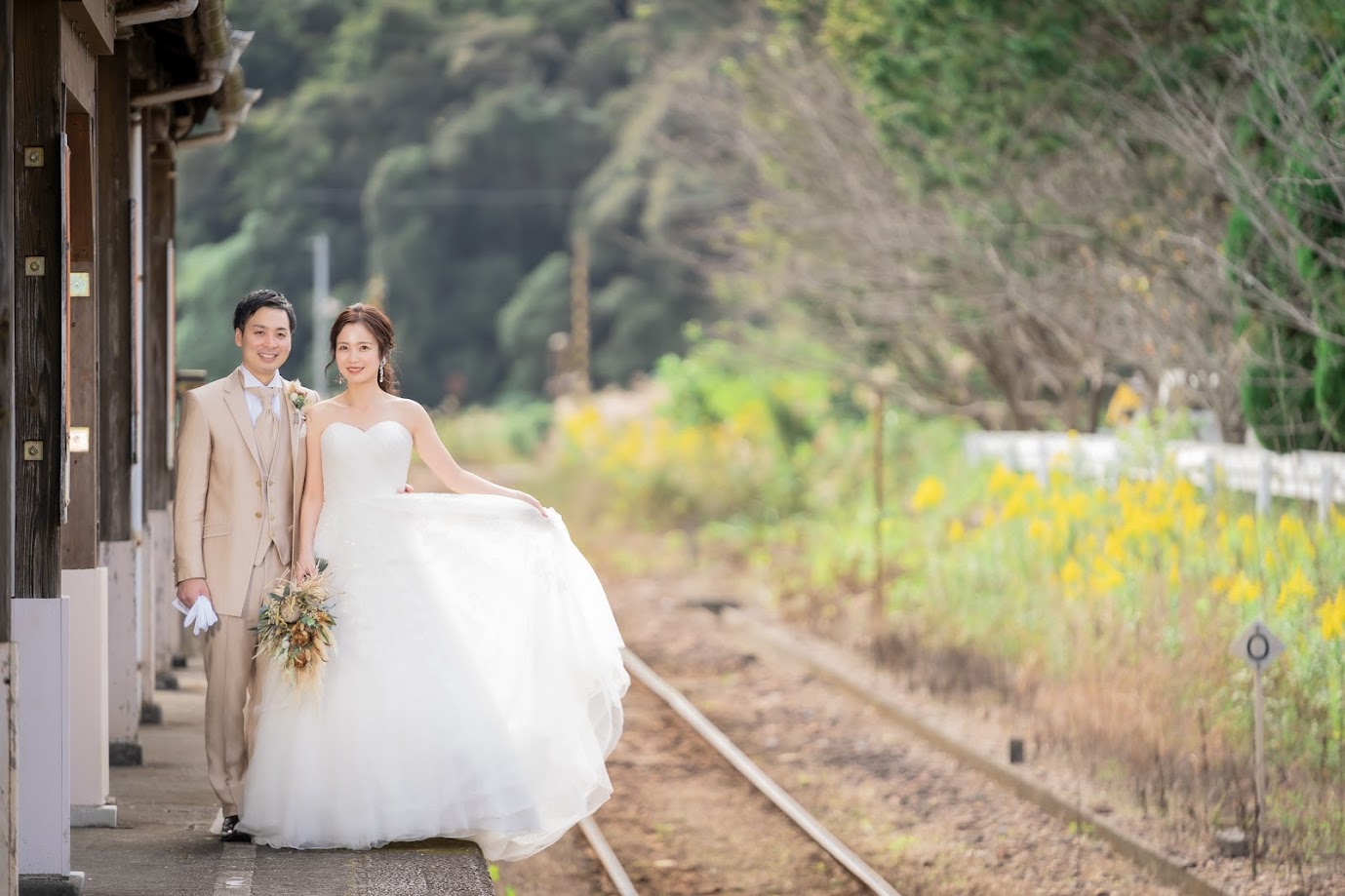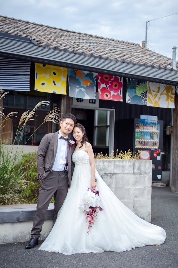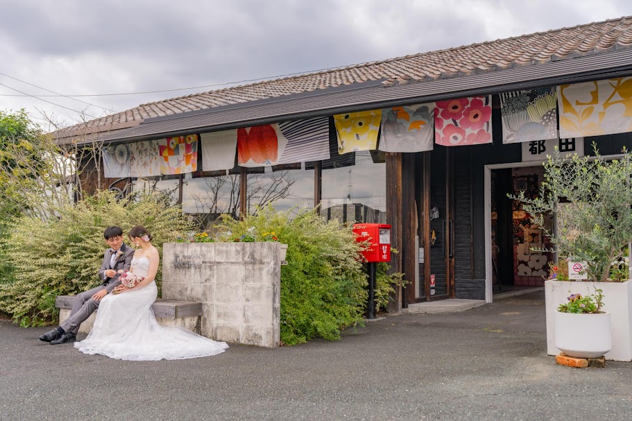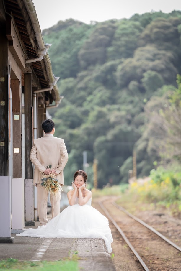都田駅(みやこだえき)はレトロな雰囲気が人気の無人駅ですが、とてもおしゃれなので撮影リクエストも多いロケ地です。マリメッコのファブリックボードが新郎新婦の衣裳ととても似合いますね。